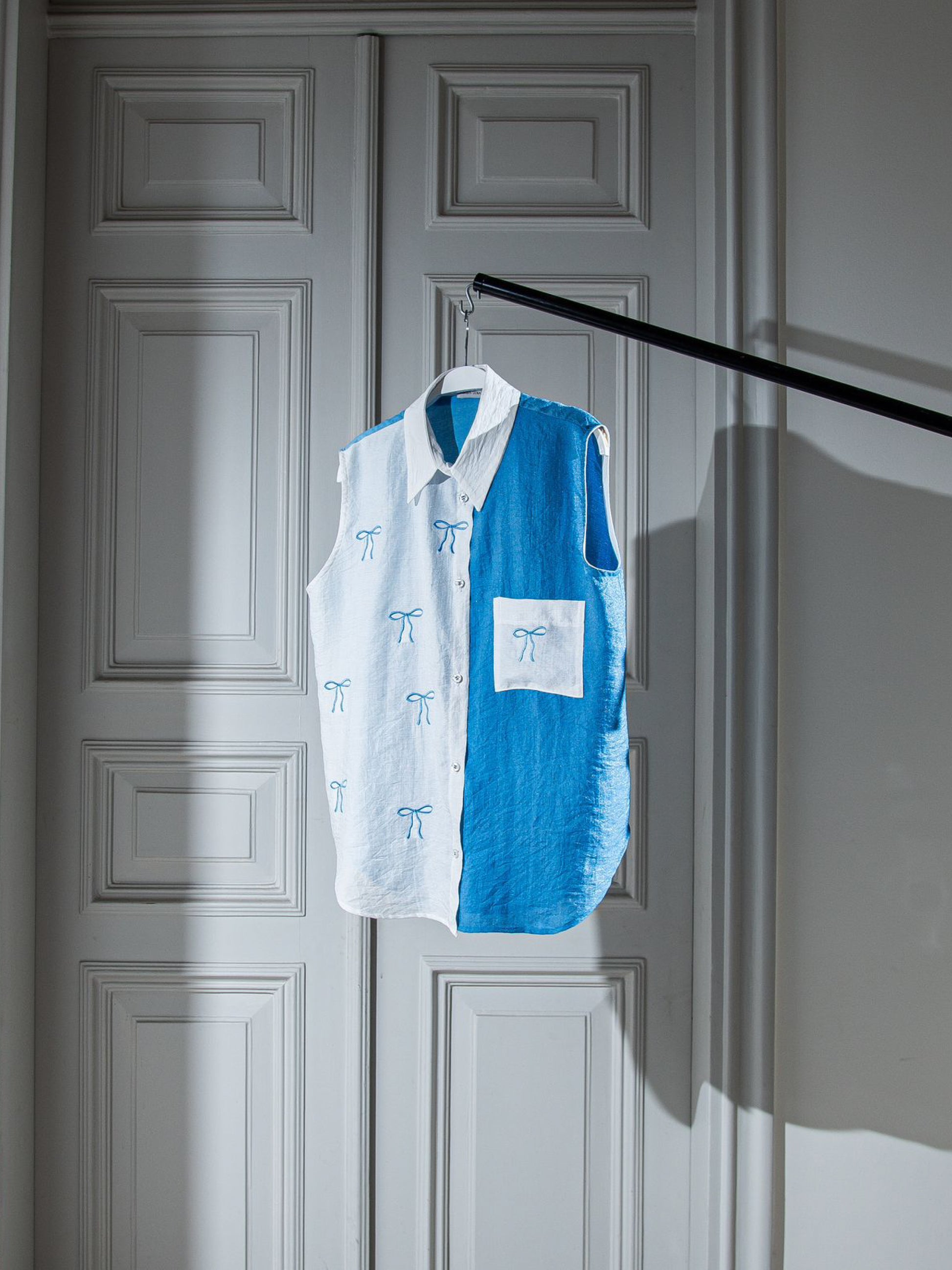 FD Cotton Linen Shirt mixed with white & gradation of blue with embroidery bows on the white side of the shirt