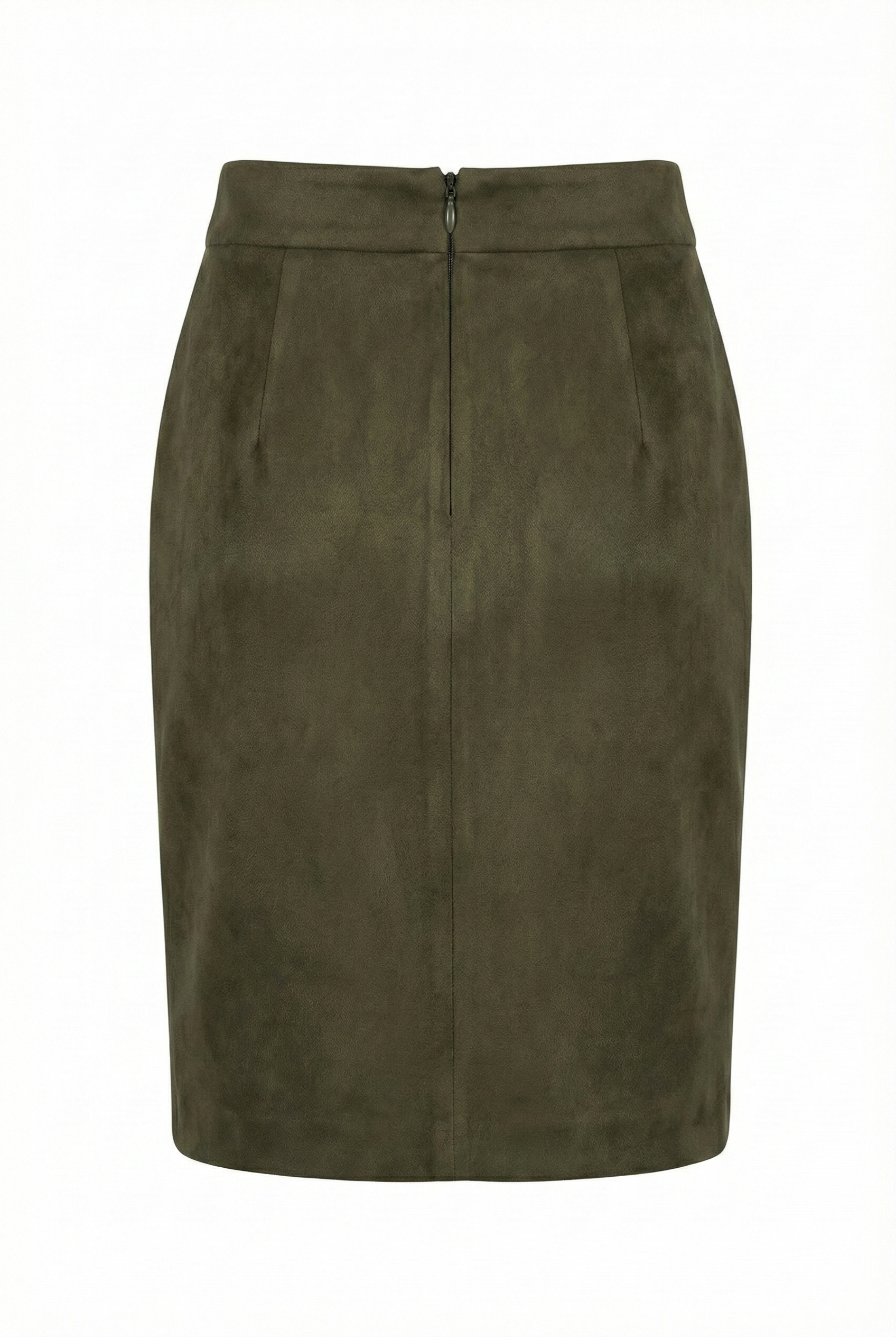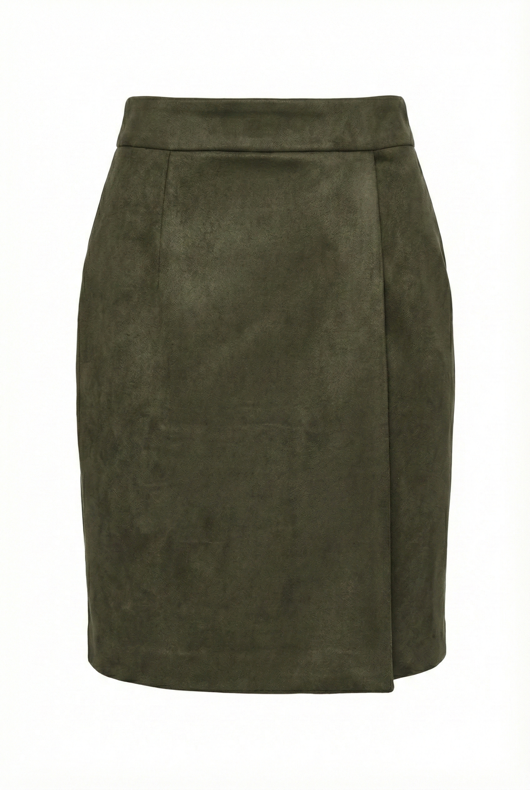 A sleek suede-effect skirt in a rich olive tone, designed with a clean pencil silhouette and subtle front wrap detail. Its soft-touch finish and minimalist structure bring refined elegance to any look.